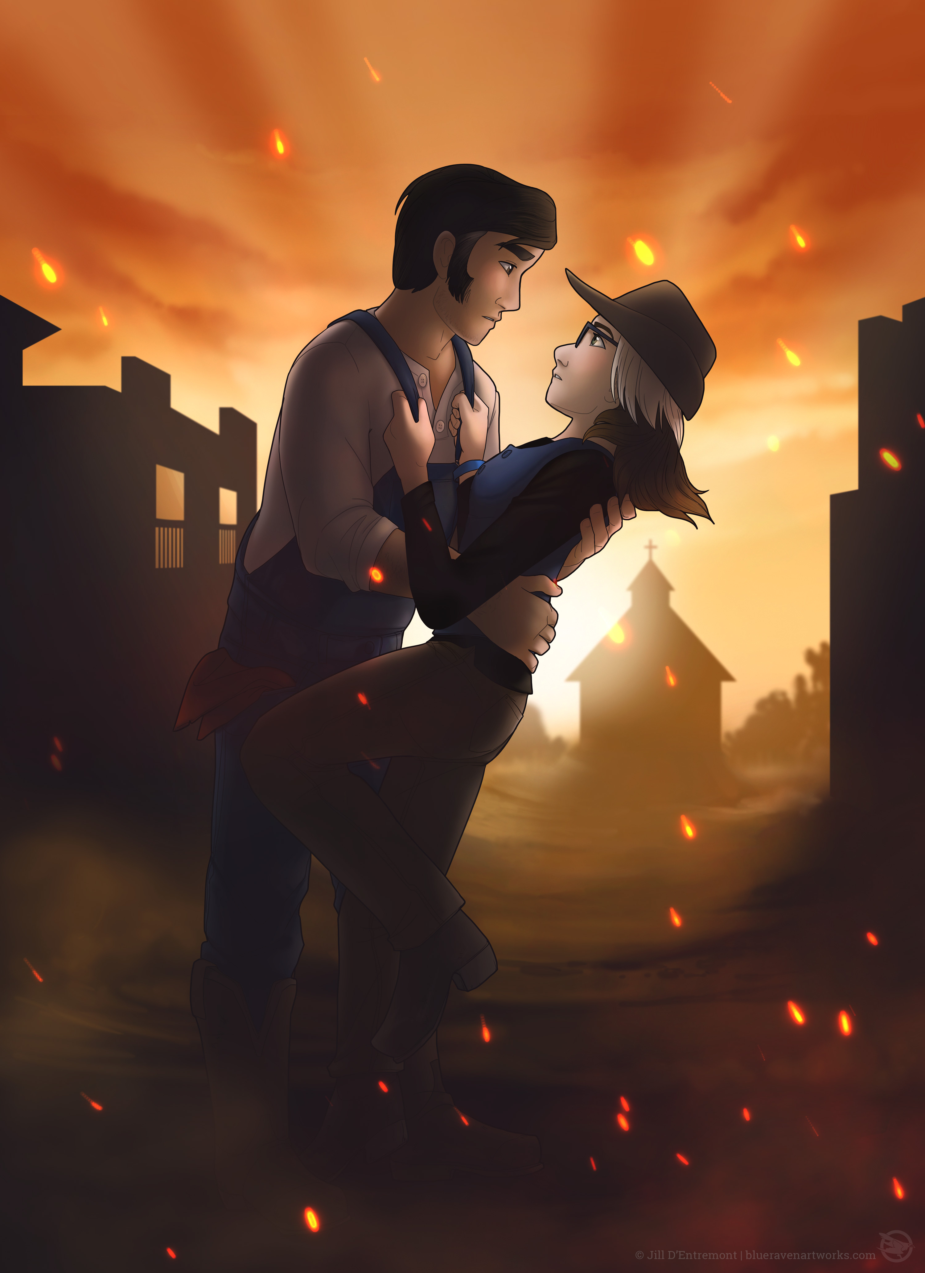 I looked at a few too many Western romance book covers and wanted to try something similar; a guy and a girl, holding each other closely, looking into each other's eyes with longing and wonder as the sky bursts alight in a sunset... and because Gemini is involved, there's smoke and embers. A beautiful Will Ackerman song (and title) did the rest.